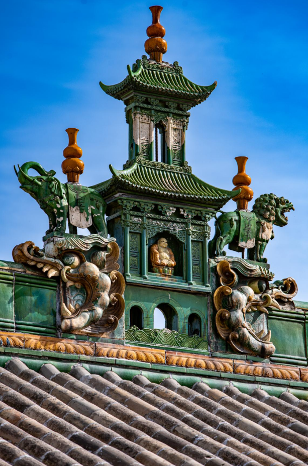 金代始建,现存主殿为明代遗构,殿顶琉璃吻兽色彩艳丽,龙凤纹样栩栩如生,堪称“明代琉璃天花板”。