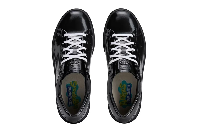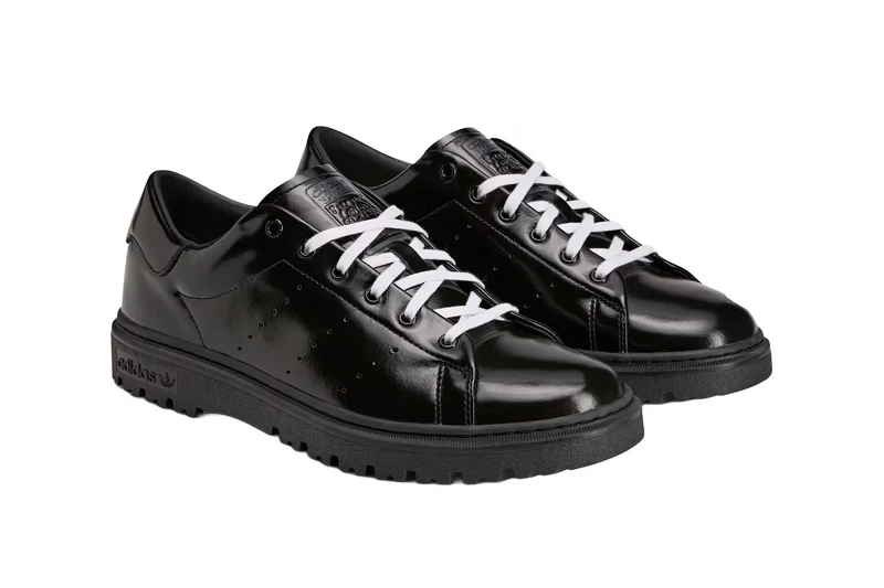 将卡通玩味与经典鞋款碰撞出令人玩味的风格,Freizeit 版本的 adidas Stan Smith 以俐落雾面黑漆皮鞋面登场,白色鞋带对比鲜明,鞋舌笑脸细节让童趣感十足。